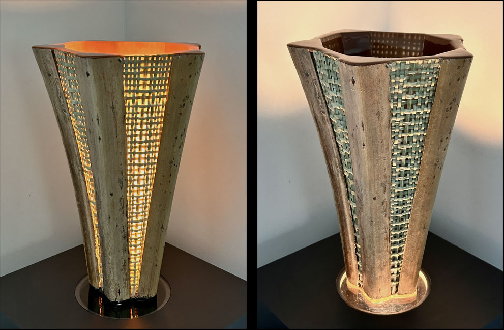 Changing the illumination can change the visual aspects of any object – the appearance is determined by how the object reflects light. The illumination can be changed in several ways that directly impact how the light is reflected. When I consider a design for one of my creations, I consider how it might be illuminated when displayed, or whether illumination should even be considered. I prefer light with a cooler temperature, but directionally, I have no preference. It is an advantage to be able to vary intensity depending on ambient light. Some creations offer more than one illumination option, as evidenced in the following photograph. The image on the left demonstrates illumination of the vase from within, accomplished with LED light strips. The image on the right demonstrates uplighting from a lighted pedestal. Which do you prefer?