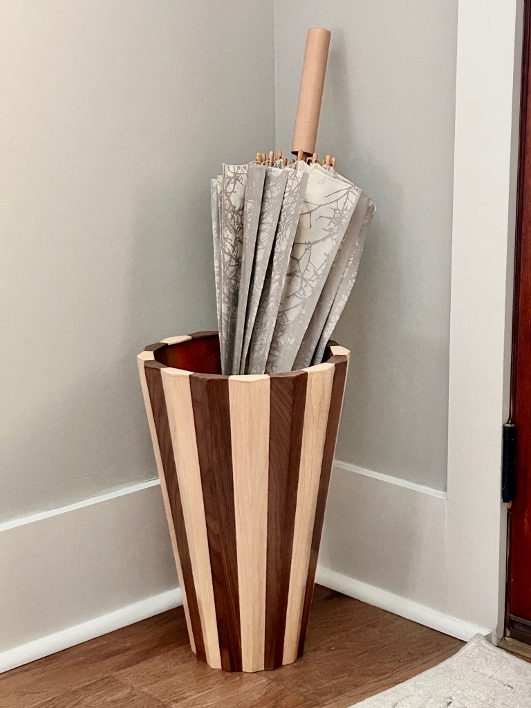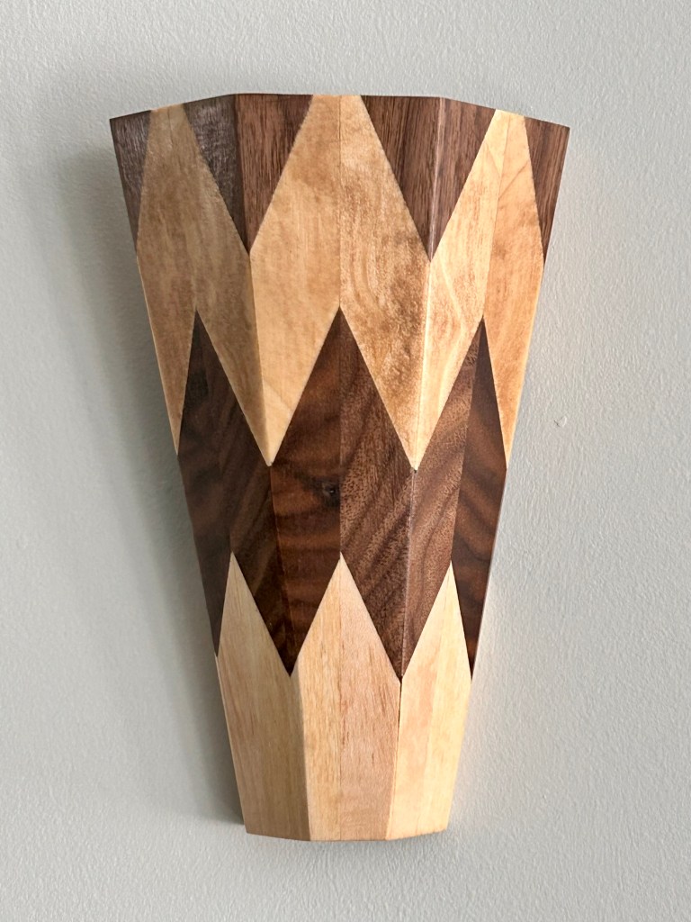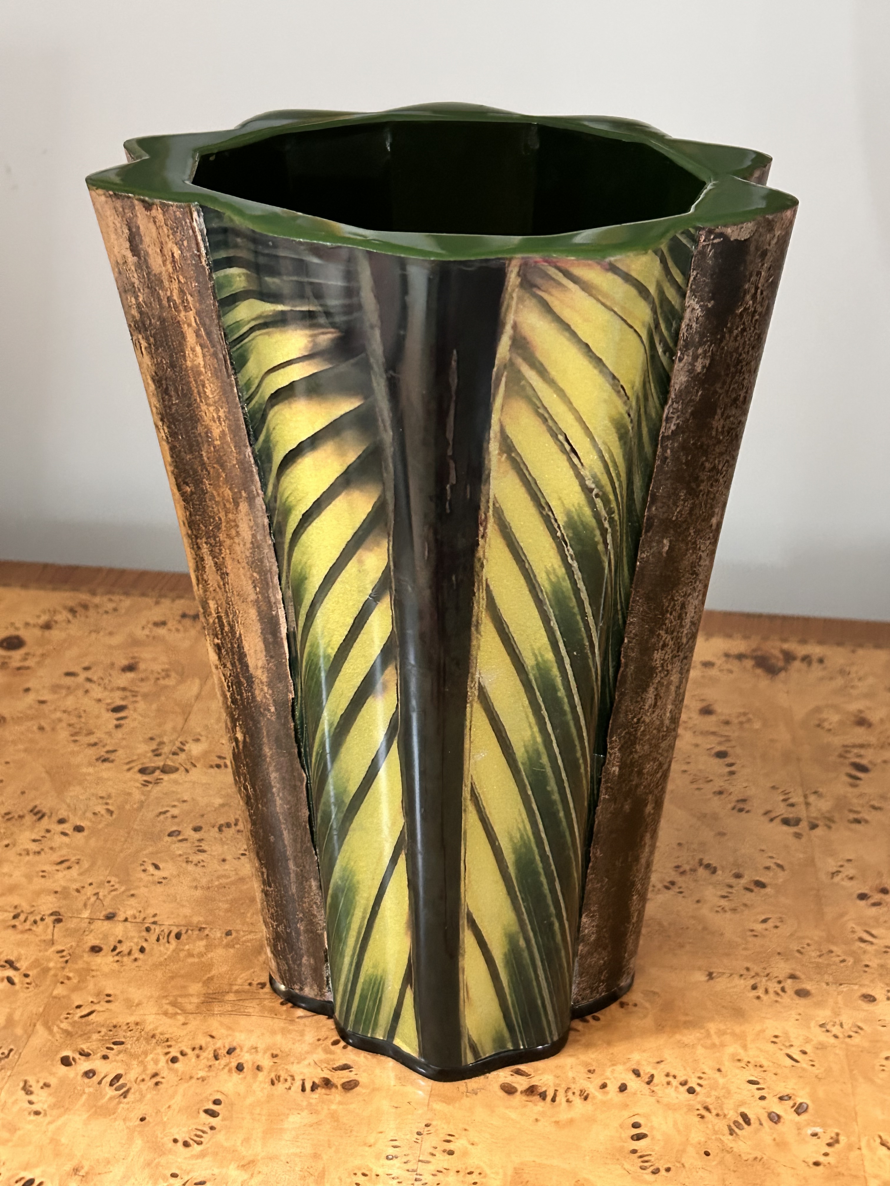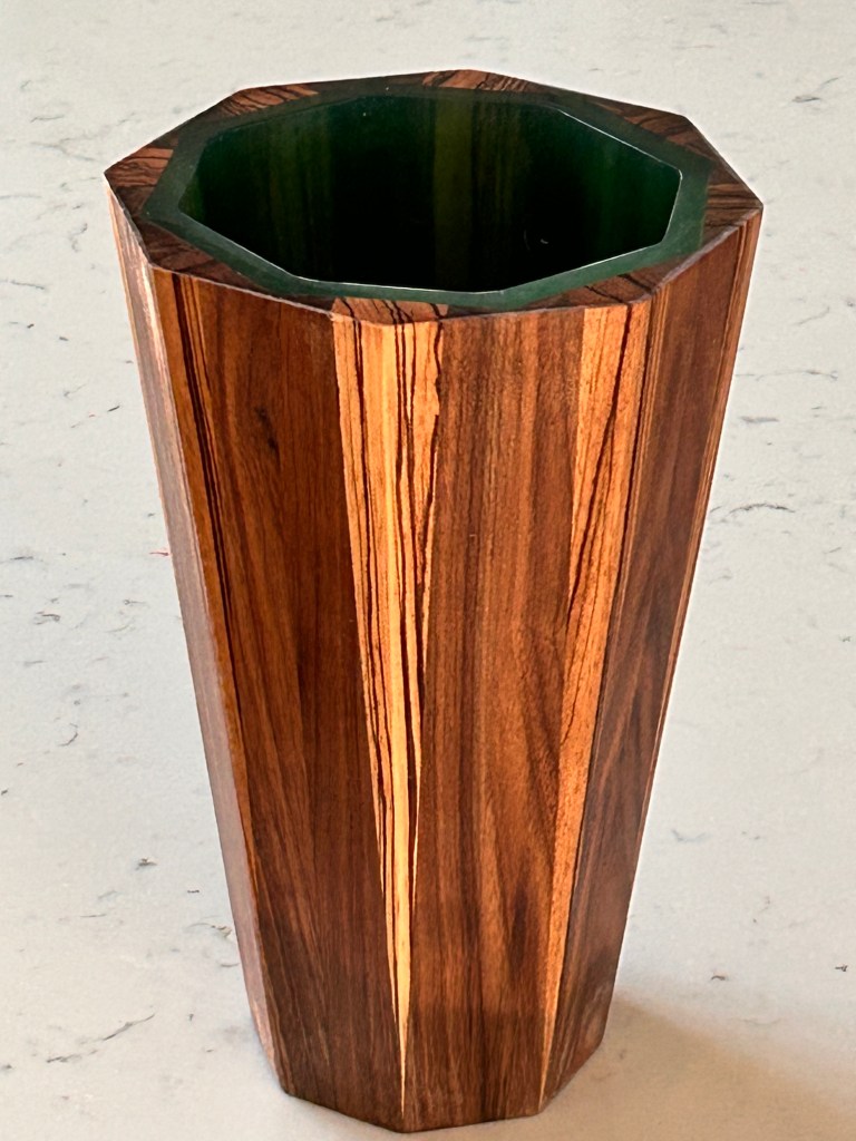 This is a “photo vase”. I started with a photograph I took of the underside of a palmetto frond. I had it printed on clear transparent film, and added a pearlescent layer of epoxy resin. It was then shaped to resemble three “staves” of a ten-sided vase, with seven palmetto fronds completing the design. Two LED light strips were then added to the inner wall of the vase for backlighting, and the interior vessel was finished with what has become my standard epoxy resin technique – that makes it 100% water tight…like all my vases.